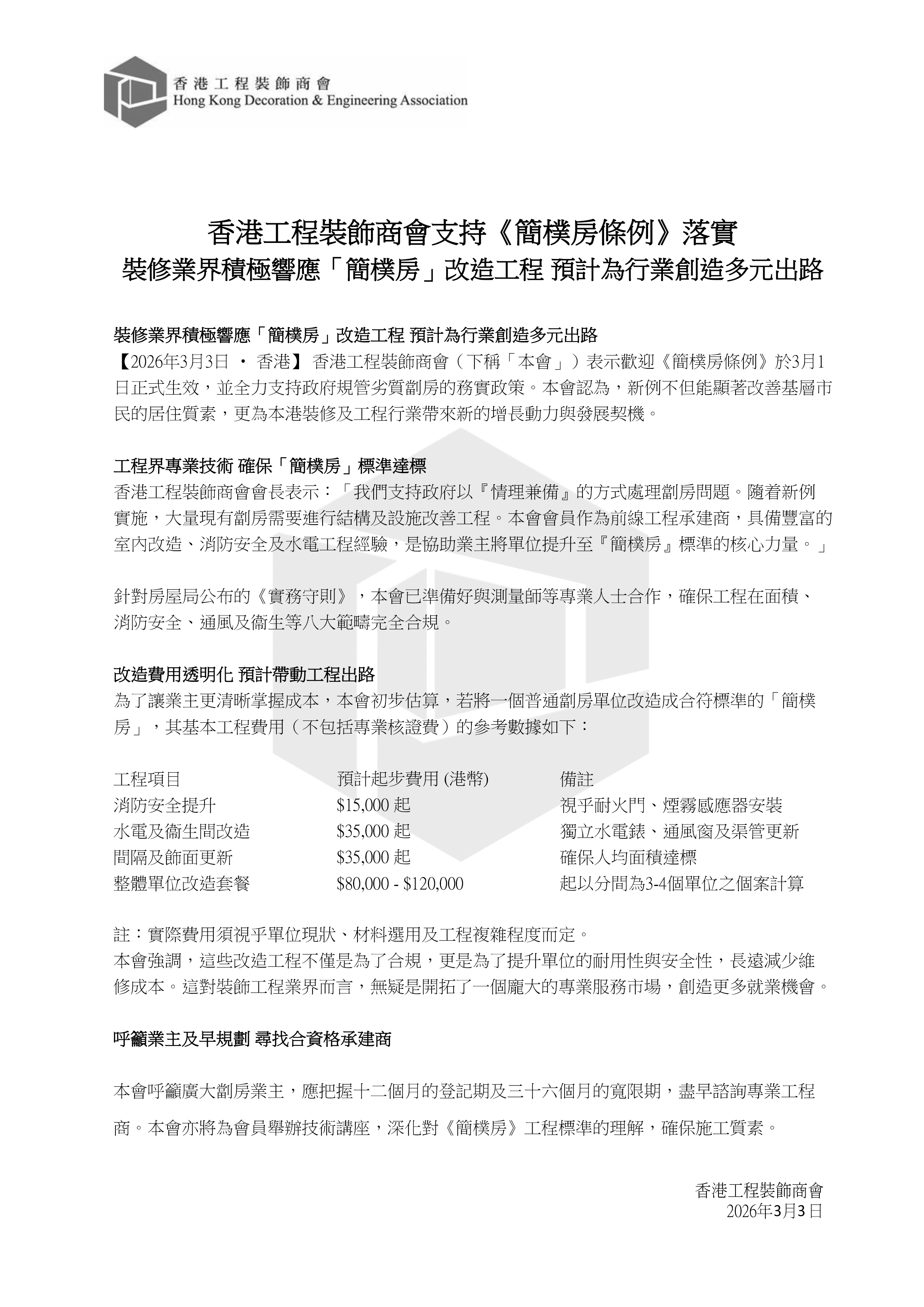 【2026年3月3日 ‧ 香港】 香港工程裝飾商會(下稱「本會」)表示歡迎《簡樸房條例》於3月1日正式生效,並全力支持政府規管劣質劏房的務實政策。本會認為,新例不但能顯著改善基層市民的居住質素,更為本港裝修及工程行業帶來新的增長動力與發展契機。