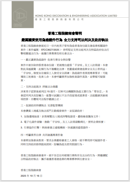 香港工程裝飾商會聲明 嚴厲譴責使用偽造證件行為 全力支持司法判決及政府執法